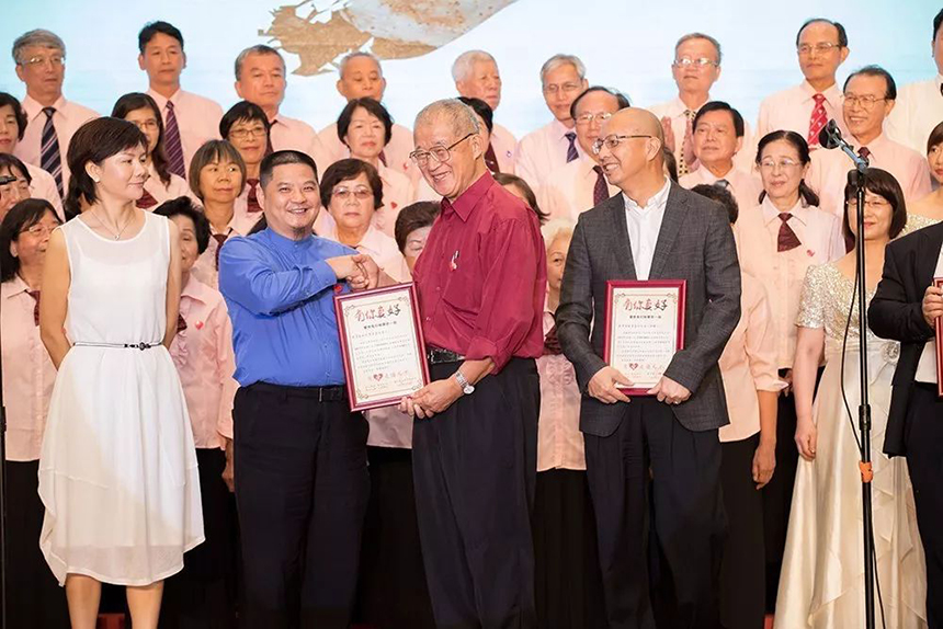 ▲新華愛基會創(chuàng)辦人王建煊為愛心捐助人代表寶鷹集團副總裁古樸呈遞感謝函