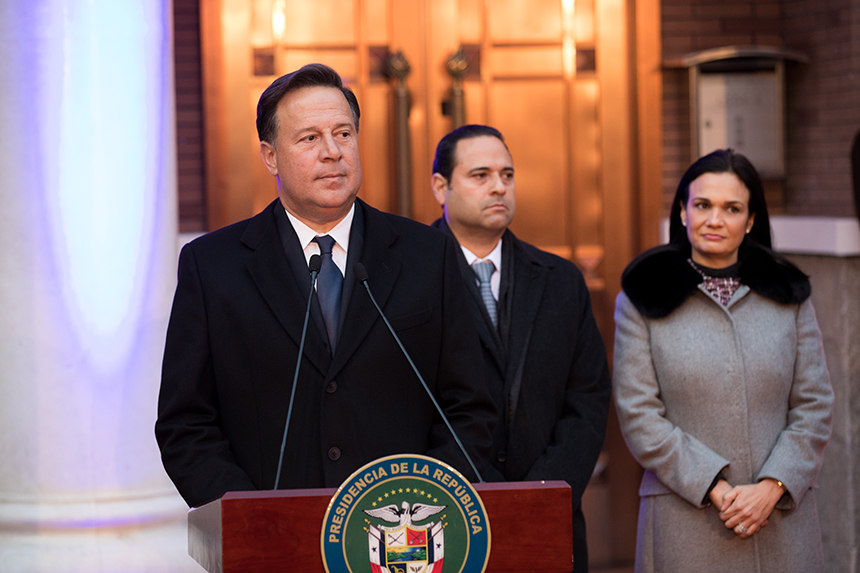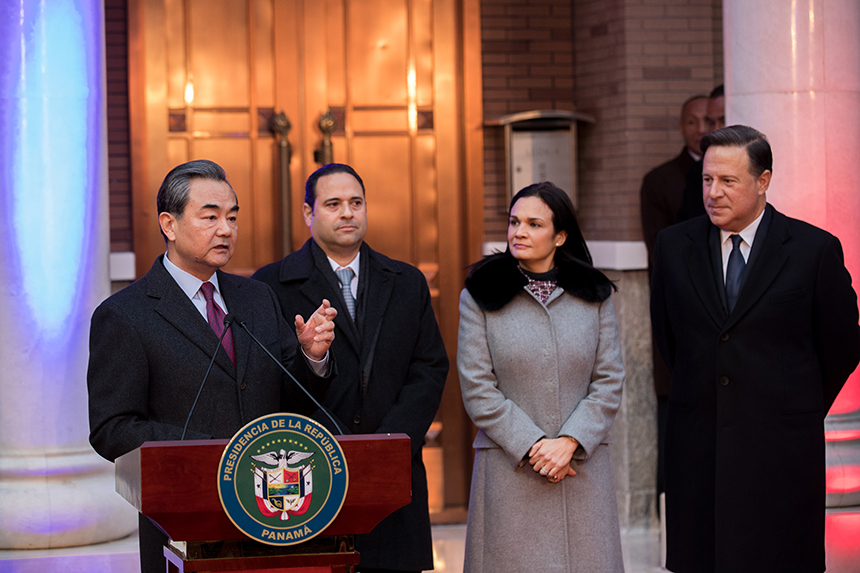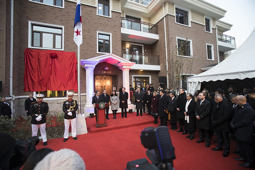 11月16日下午,巴拿馬共和國駐華使館開館儀式在北京舉行,巴拿馬總統(tǒng)巴雷拉、中國外交部長王毅共同出席開館儀式。巴雷拉總統(tǒng)衛(wèi)隊(duì)升起巴拿馬國旗,中國軍樂隊(duì)分別演奏中、巴兩國國歌,巴拿馬國旗第一次在中國的心臟首都北京上空飄揚(yáng)。