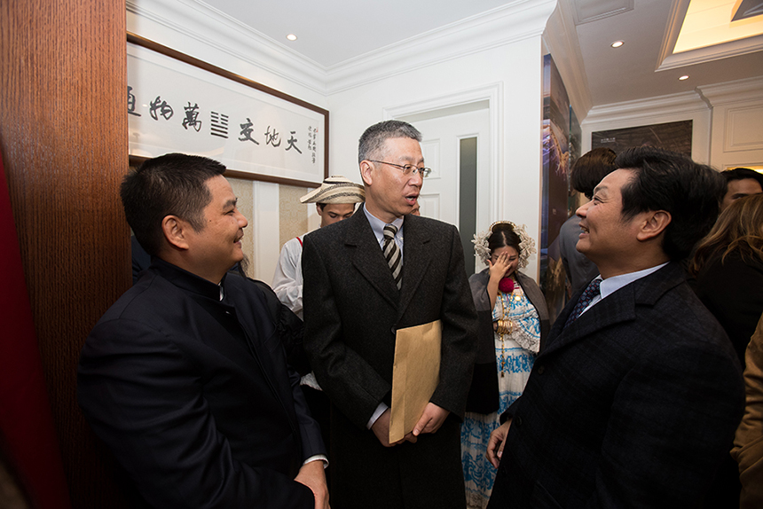 ▲巴拿馬駐華大使施可方(左二)、中國駐巴拿馬大使魏強(qiáng)(左三)與古少明主席(左一)、古樸副總裁(右二)在“天地交 萬物通”書畫作品前合影留念,期待中巴友誼與經(jīng)貿(mào)合作前景無限