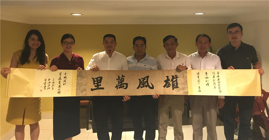 ▲寶鷹集團(tuán)副總裁古樸(左三)向柬埔寨國(guó)家警察總署副總長(zhǎng)查哈利特將軍(左四)贈(zèng)送西泠社人、寶鷹美術(shù)館館長(zhǎng)王躍慶書法作品《雄風(fēng)萬里》