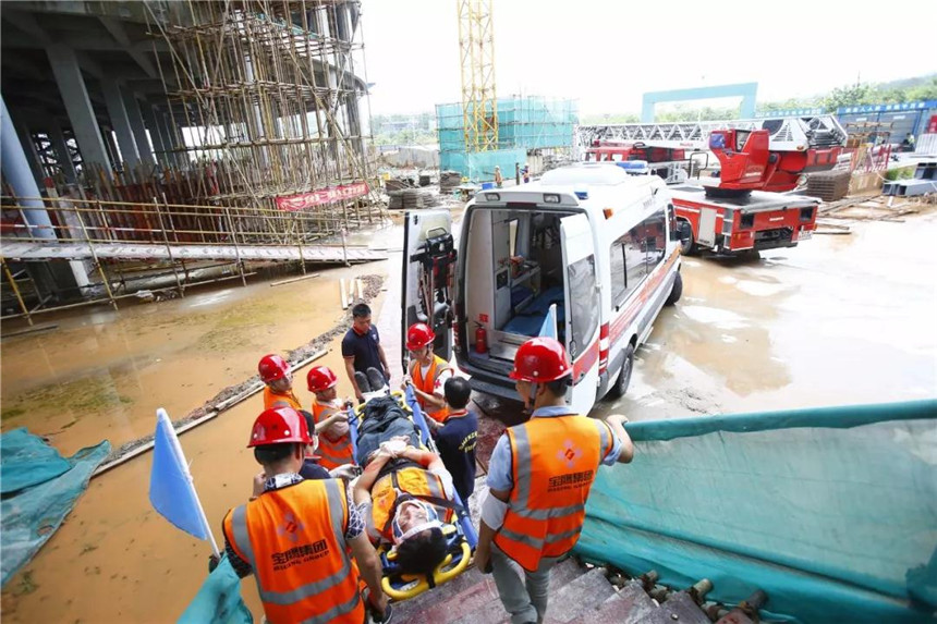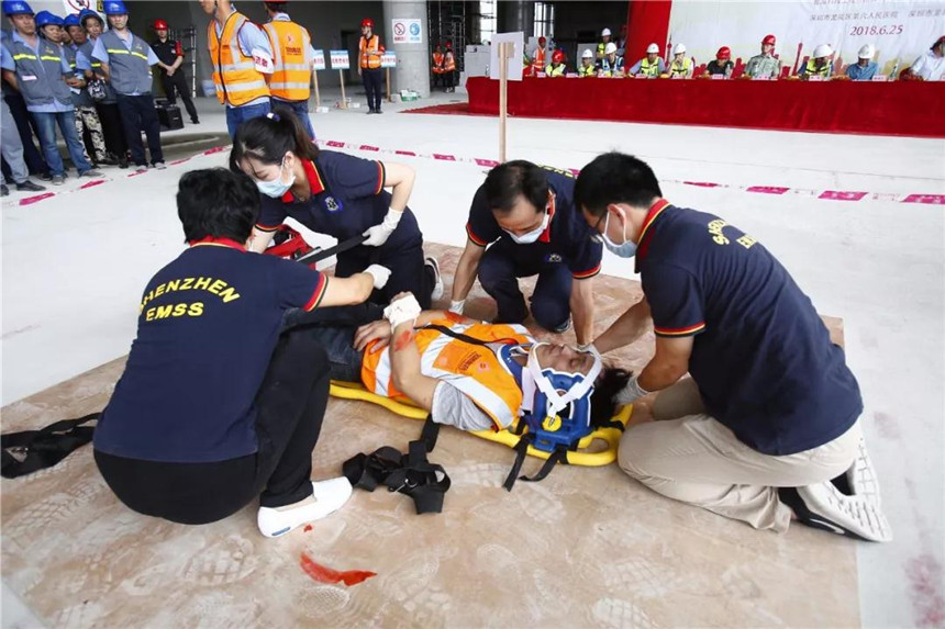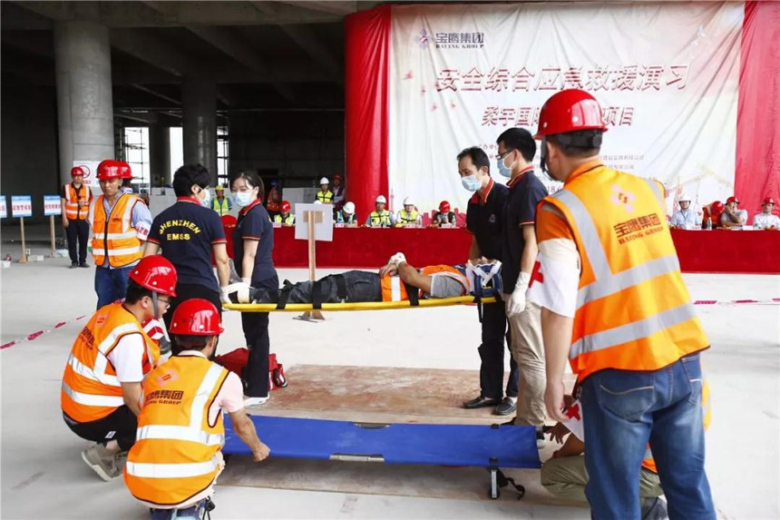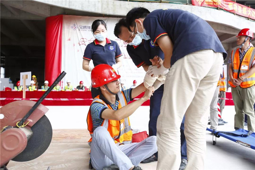演習項目分為機械傷害演練、觸電傷害演練、高處墜落演練和消防疏散演練。來自寶鷹集團質安管理部、幕墻事業(yè)部和柔宇項目部的九十余名員工,分為安全通訊、疏散警戒、搶險救援、醫(yī)療救護等多組集結成隊,井然有序地參與演習。