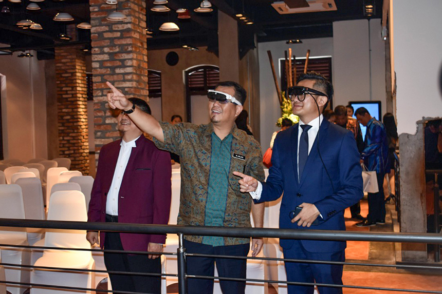 ▲馬六甲旅游、文化及遺產(chǎn)委員會主席莫哈末再拉尼(左二)與寶鷹集團副總裁古樸(左一)、太平洋未來科技CEO 李建億(右一)體驗AM Glass
