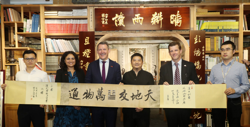 ▲寶鷹集團(tuán)常務(wù)副總裁古樸贈(zèng)與澳大利亞北領(lǐng)地洲政府省長邁克爾· 剛納(Hon Michael Gunner MLA)寶鷹美術(shù)館館長王躍慶書法作品“天地交 萬物通”