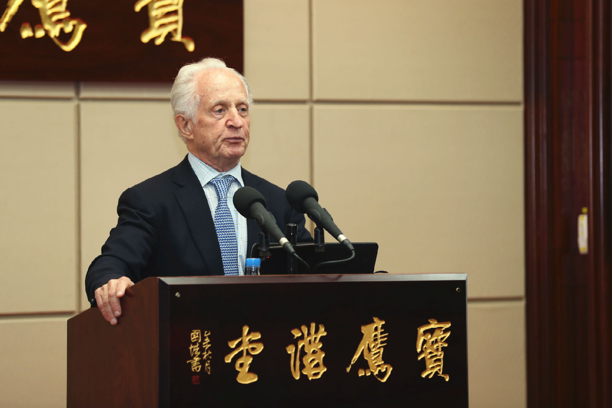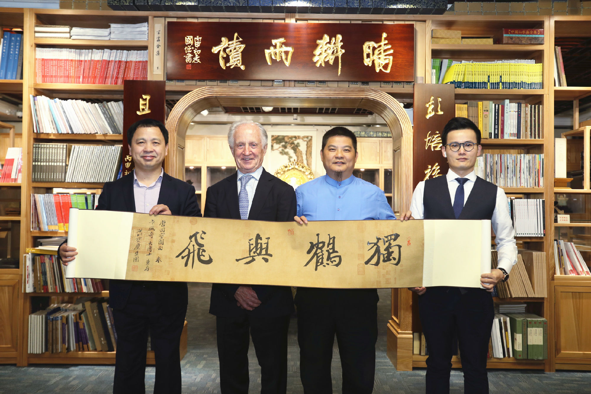 ▲寶鷹集團(tuán)副總裁古樸向卡佩奇院士贈(zèng)送西泠印社社員、寶鷹美術(shù)館館長(zhǎng)王躍慶書法作品《獨(dú)鶴與飛》