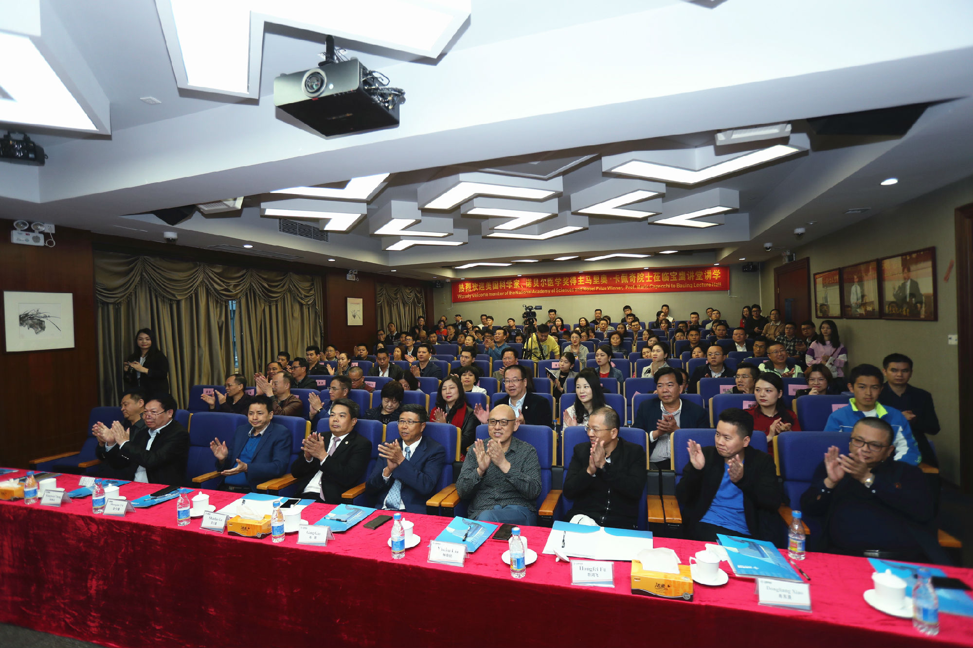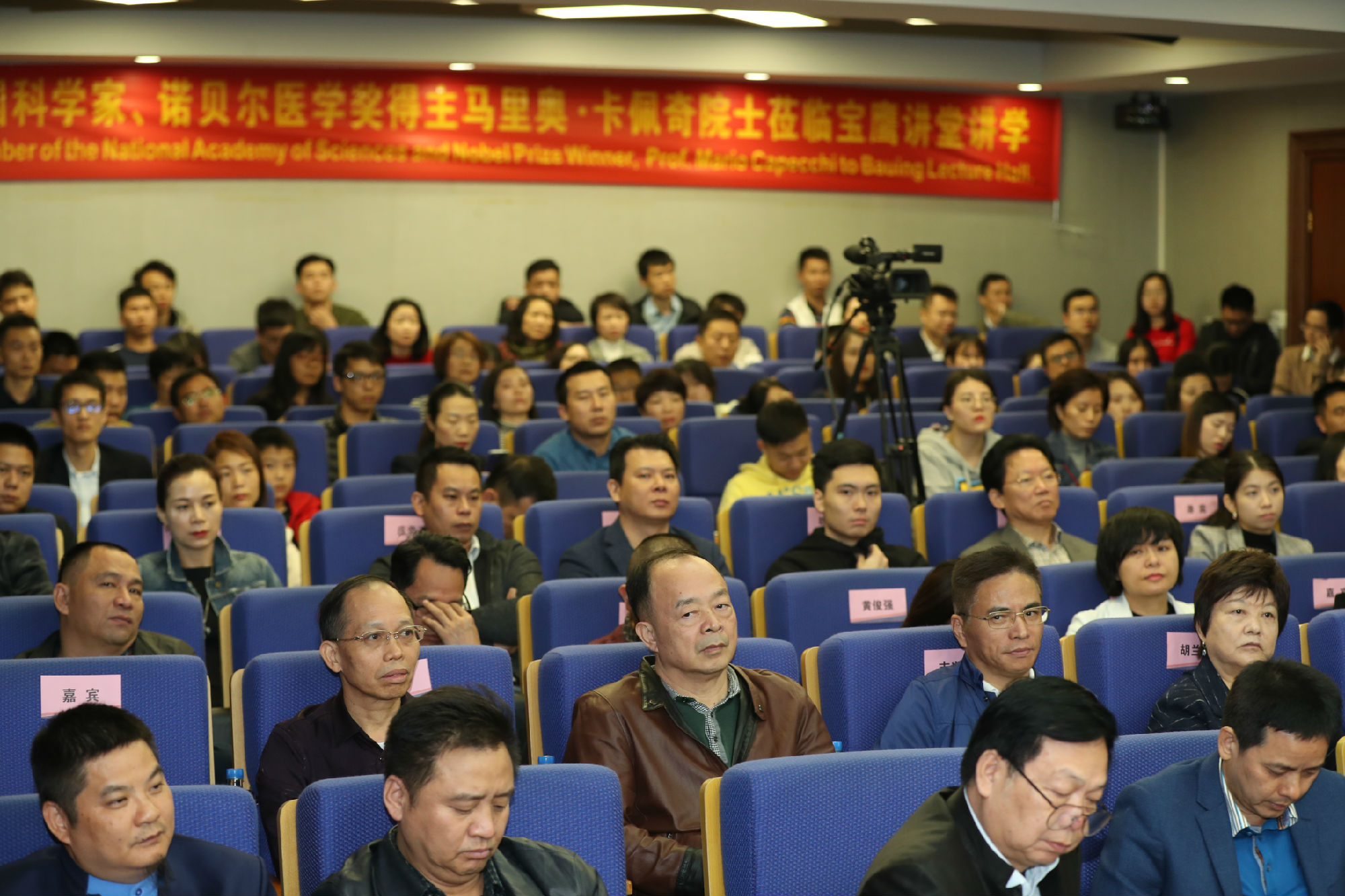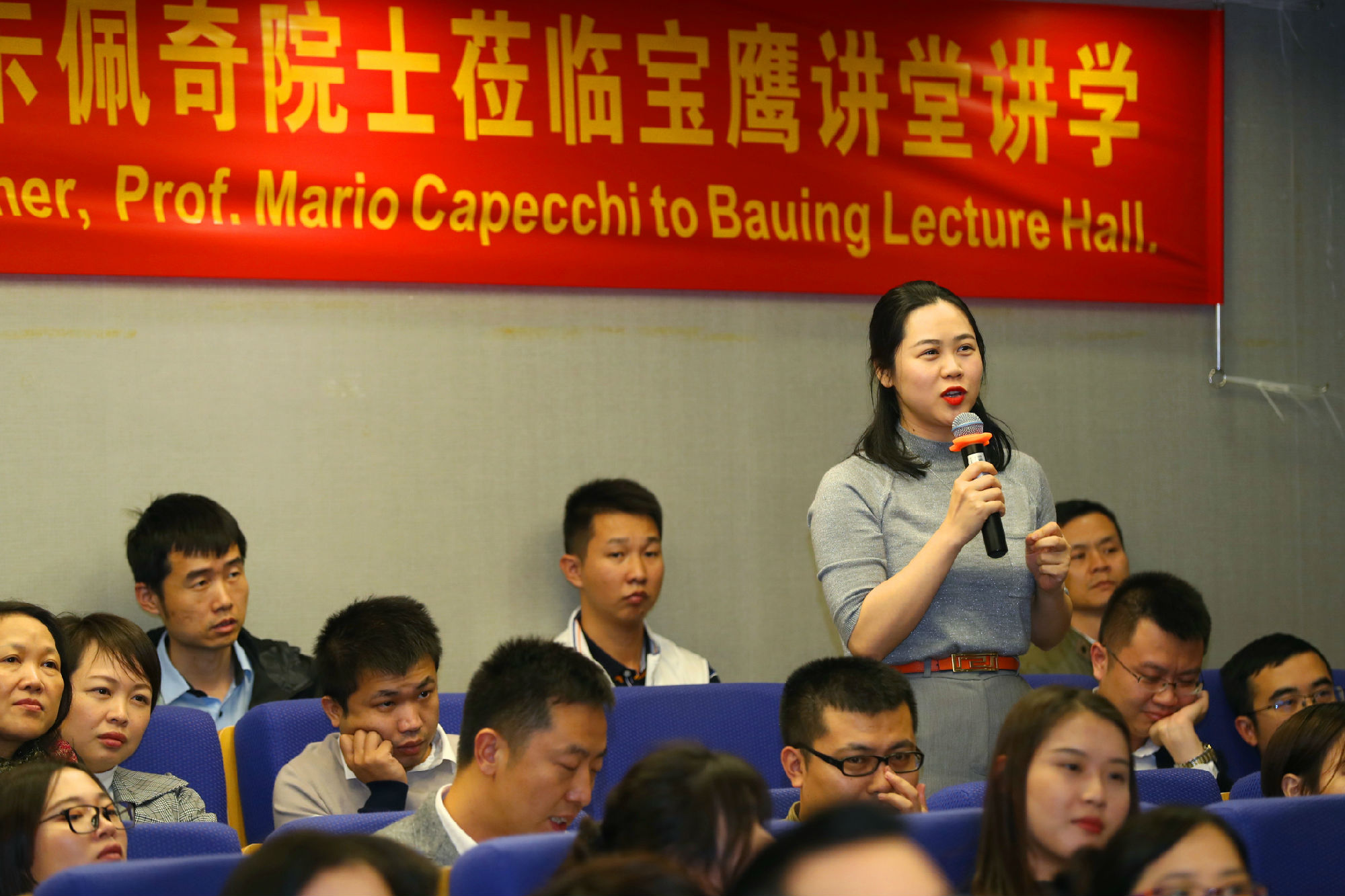 馬里奧·卡佩奇院士博士生、中國(guó)農(nóng)業(yè)大學(xué)吳森教授隨行并實(shí)時(shí)傳譯??ㄅ迤嬖菏康木史窒硪鹆嗽谧襟w及聽(tīng)眾的熱烈探討。