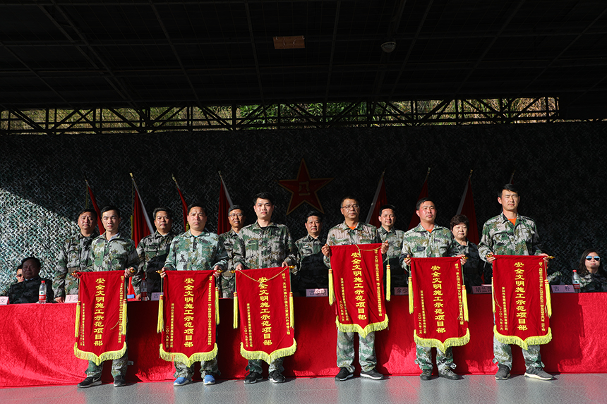 ▲深圳裝飾協(xié)會(huì)會(huì)長(zhǎng)高剛,寶鷹集團(tuán)董事局主席古少明,寶鷹股份董事長(zhǎng)古少波為“安全文明施工示范項(xiàng)目部”頒獎(jiǎng)