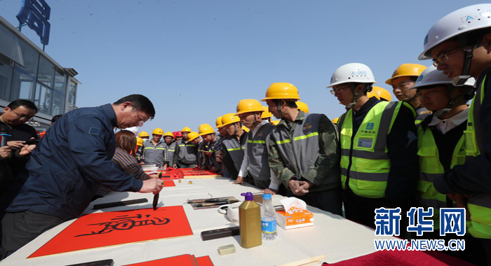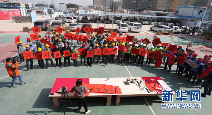 王躍慶為建設(shè)者們現(xiàn)場(chǎng)寫(xiě)“?!弊帧P氯A網(wǎng)發(fā)