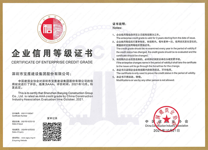 多年來,寶鷹集團始終秉承“誠信為人、嚴(yán)謹(jǐn)做事、共同發(fā)展”的經(jīng)營理念,倡導(dǎo)企業(yè)誠信文化,弘揚誠信傳統(tǒng)美德,樹立法律意識、責(zé)任意識,強化企業(yè)內(nèi)部誠信管理,連續(xù)獲得中國守合同重信用企業(yè)、中國優(yōu)秀誠信企業(yè)、中國建筑業(yè)AAA級信用等級企業(yè)、中國建筑裝飾協(xié)會AAA級信用等級企業(yè)、廣東省最佳誠信企業(yè)、廣東省守合同重信用企業(yè)等榮譽。