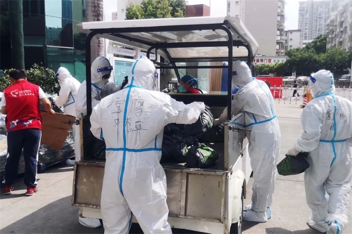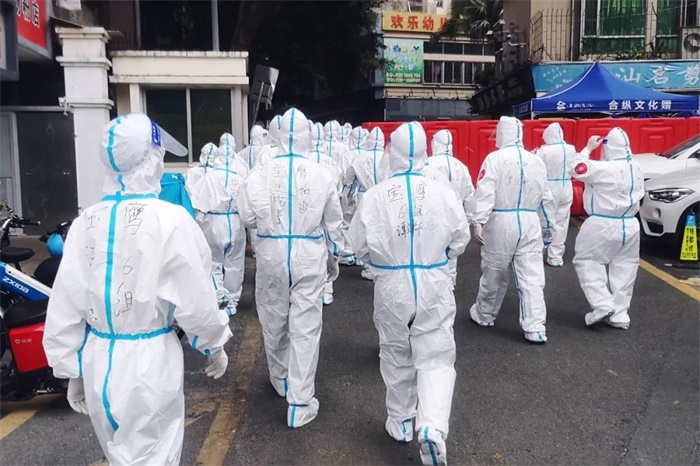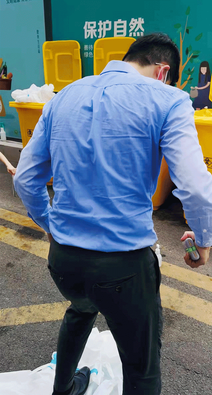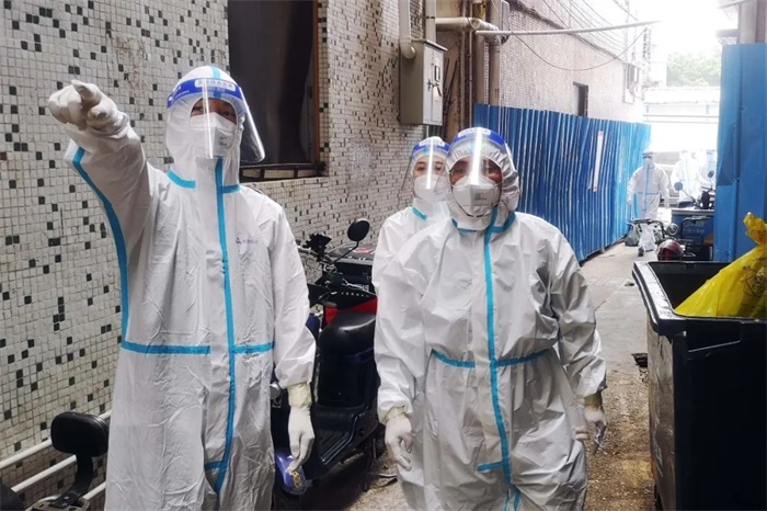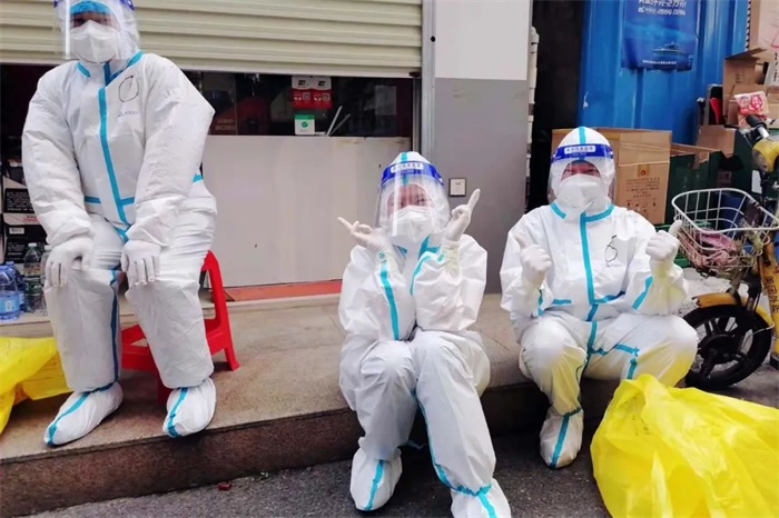 正值陽(yáng)春三月,但深圳的氣溫已接近三十度,室外體感溫度更高。他們不分性別、不分年紀(jì),穿著密不透風(fēng)的防疫服,帶著雙層防疫手套,卸車、分揀、搬運(yùn),提著沉重的生活保障物資,挨家挨戶送貨上門、清理垃圾,一趟下來(lái),身上早已汗如雨下。