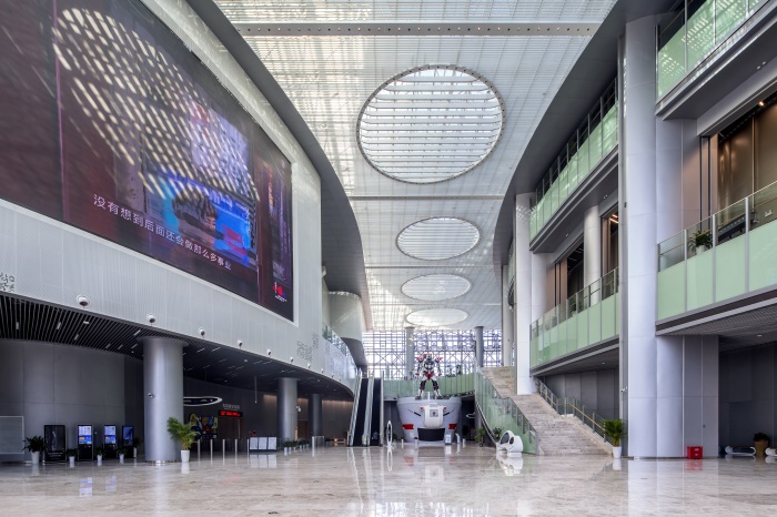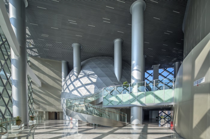 科技館大廳及公共區(qū)域內(nèi)運(yùn)用了大量的夾層設(shè)計,配以超高鋁板立柱和大面積的銀色鋁板幕墻,使空間顯得高大寬敞、開放通透,未來感和科技感十足。