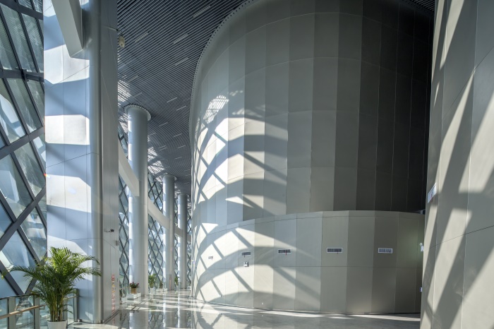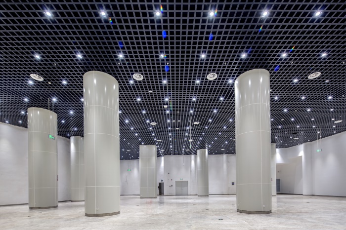 林立在各處的立柱,最高的有21.75m,直徑達(dá)1.6m。立柱與鋁板的垂直高度、拼接縫橫豎對齊,使場館整體高端大氣,科技感十足。
