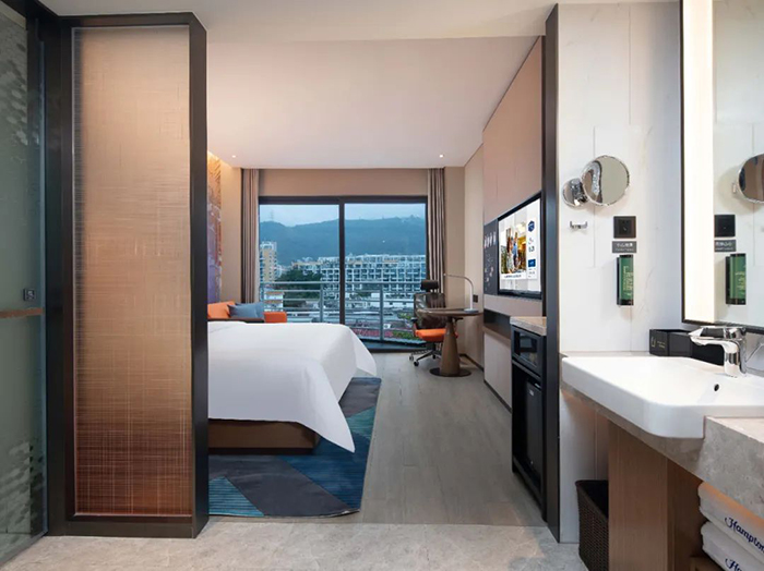 項目以希爾頓歡朋酒店4.0標準打造建設(shè),高質(zhì)量高標準,128間客房全部采用美國“Hampton Bed” 標準的高端用品,對材料管理和施工工藝要求極高。項目團隊嚴格管控材料使用,加強材料和設(shè)備的“四驗”工作,做到分類分批保管和堆放。在施工中,嚴抓細節(jié),規(guī)范作業(yè),建立樣板先行制度,對每道工序,每項產(chǎn)品進行逐一確定,再進行大面積標準化施工,既保證工程質(zhì)量,又提高施工效率。