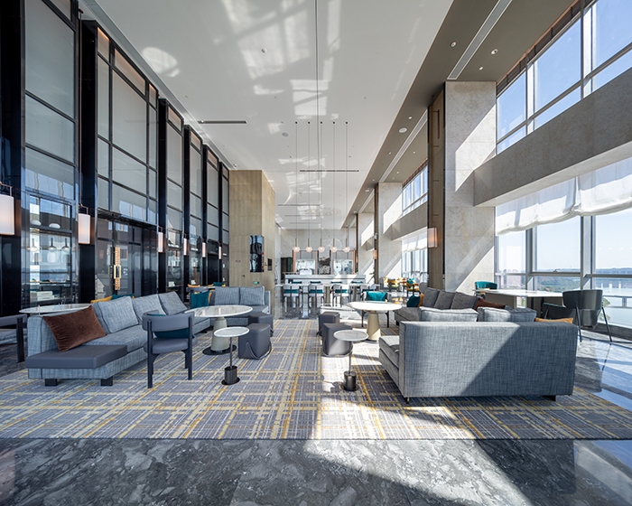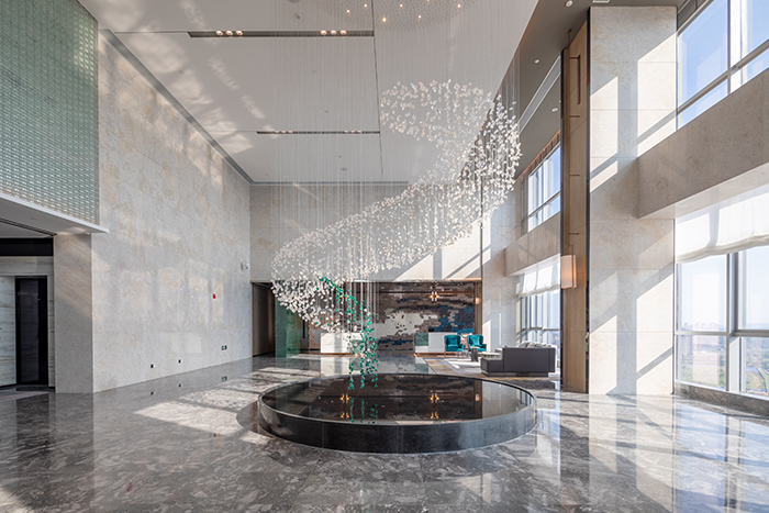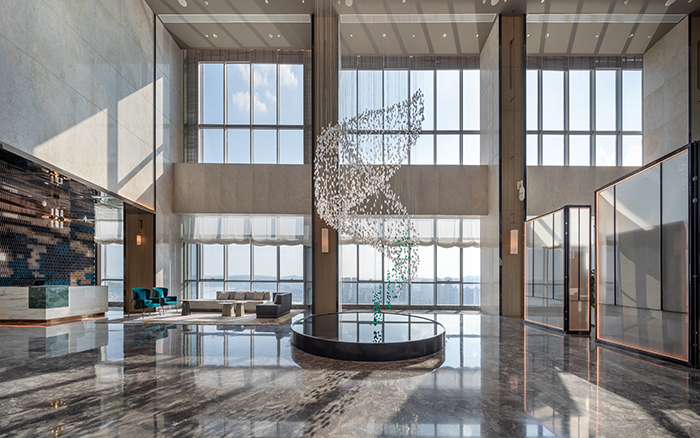 酒店的設(shè)計(jì)從南充歷史悠久的古鎮(zhèn)老街、絲綢文化汲取創(chuàng)意,將歷史文化與現(xiàn)代建筑完美結(jié)合。大堂以簡約大方的造型表達(dá),整個(gè)空間色彩明快、柔和,既現(xiàn)代簡約,又時(shí)尚活潑,從視覺上凝聚顏色,從空間上體現(xiàn)美感。110米高空的超大雙層落地窗,可俯瞰南充市全景,展現(xiàn)人們對(duì)自由生活享受的向往。