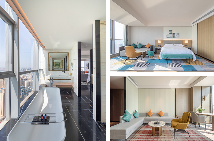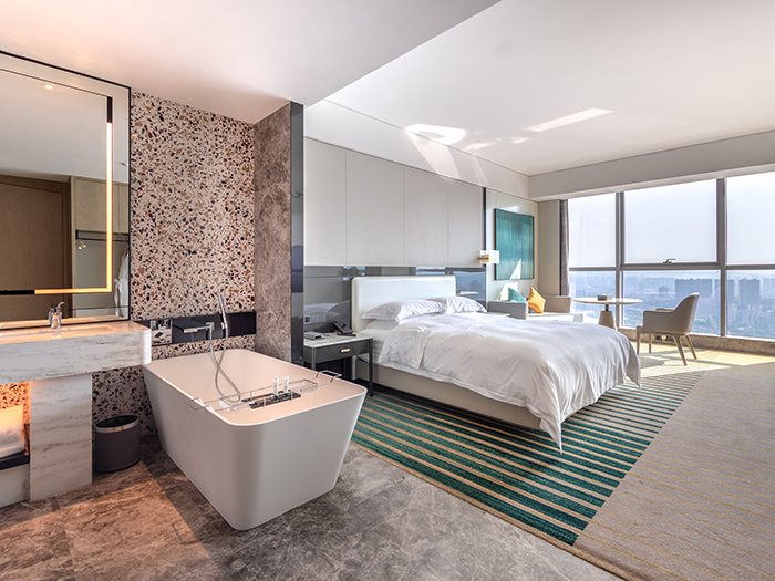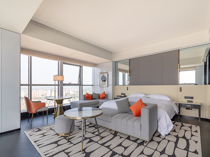 276間寬敞舒適客房,整體風(fēng)格以現(xiàn)代輕奢為主。純粹率性的豎條打底墻面搭配精致燈具,淺白色的整體屋面配合墨綠和橘紅,讓人沉浸在整潔舒適、愉悅自在的氛圍之中。窗外,嘉陵江水波光粼粼,兩岸高低錯(cuò)落的建筑和生態(tài)景觀盡收眼底,星級(jí)酒店氣質(zhì)盡現(xiàn)。