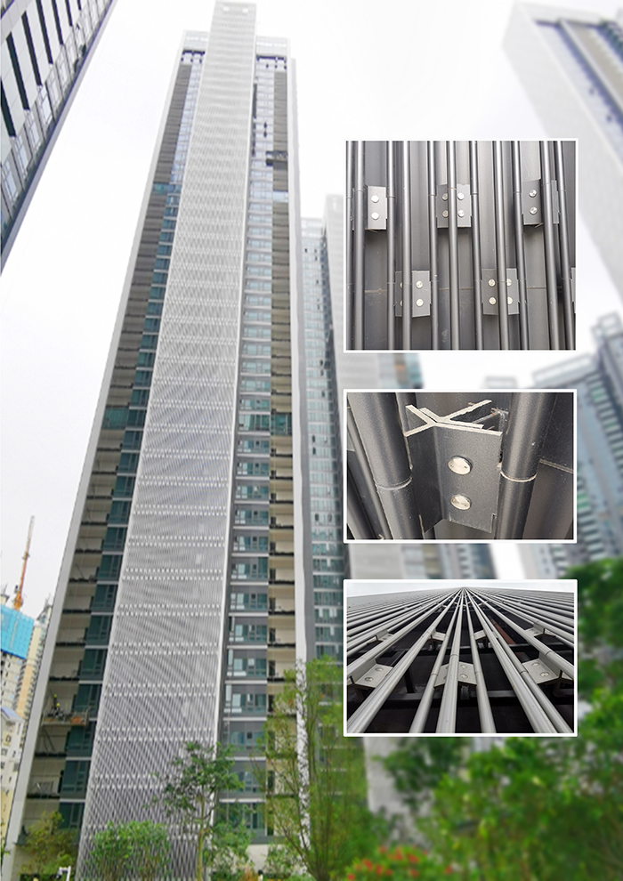 為了解決扁管形、方管形等傳統(tǒng)格柵幕墻施工的安裝技術(shù)難題,寶鷹集團(tuán)通過(guò)項(xiàng)目施工安裝實(shí)踐,積累豐富的實(shí)踐經(jīng)驗(yàn),取得了“圓管格柵幕墻施工技術(shù)”的研究成果。圓管格柵幕墻施工技術(shù)是在鋁板幕墻系統(tǒng)的基礎(chǔ)上外加圓管格柵系統(tǒng)組成的一種幕墻形式。該技術(shù)已在多個(gè)項(xiàng)目成功運(yùn)用,并取得了較好的社會(huì)效益和經(jīng)濟(jì)效益。