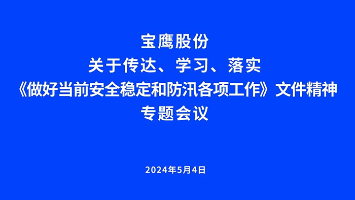 5月4日下午,寶鷹股份召開專題會(huì)議,傳達(dá)學(xué)習(xí)貫徹習(xí)近平總書記重要指示精神,貫徹落實(shí)李強(qiáng)總理批示要求,落實(shí)省、市、珠海國資委及大橫琴集團(tuán)工作部署,迅速部署做好寶鷹股份安全穩(wěn)定和防汛各項(xiàng)工作。