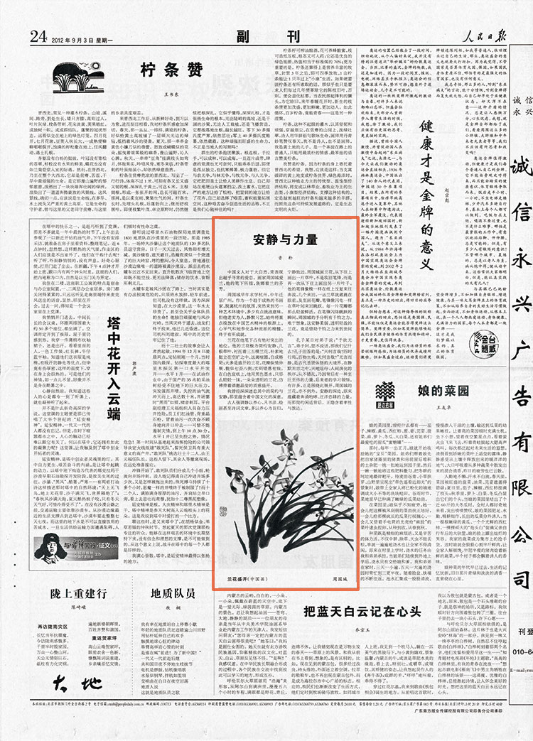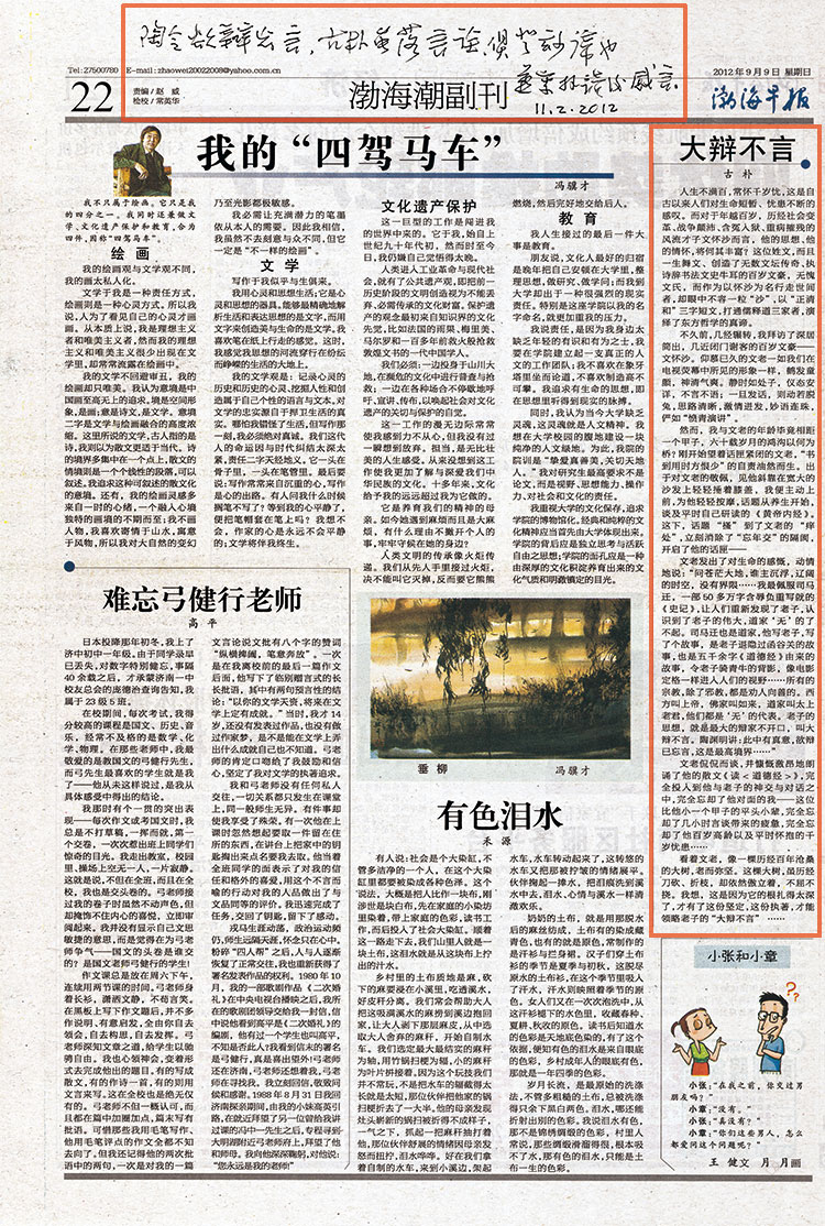 文章《安靜與力量》刊登在 9 月 3 日的《人民日報》副刊,文章《大辯不言》刊登在 9 月 9 日的《渤海早報》副刊。兩篇文章分別是古樸先生對文化名人周國城先生、文懷沙先生及其相關(guān)作品和思想的見解與感受。文章樸實、自然,文風純正,語言簡潔、明快,主旨明確、暢達,充分闡述了自己對中國文化的見解,表達了對中國傳統(tǒng)文化的熱愛以及對文懷沙、周國城等文化大師的崇敬。我國著名的國學大師文懷沙老先生讀完文章后親筆評價到“陶令欲辯忘言,古樸每落言詮,俱登妙諦也?!?/p>