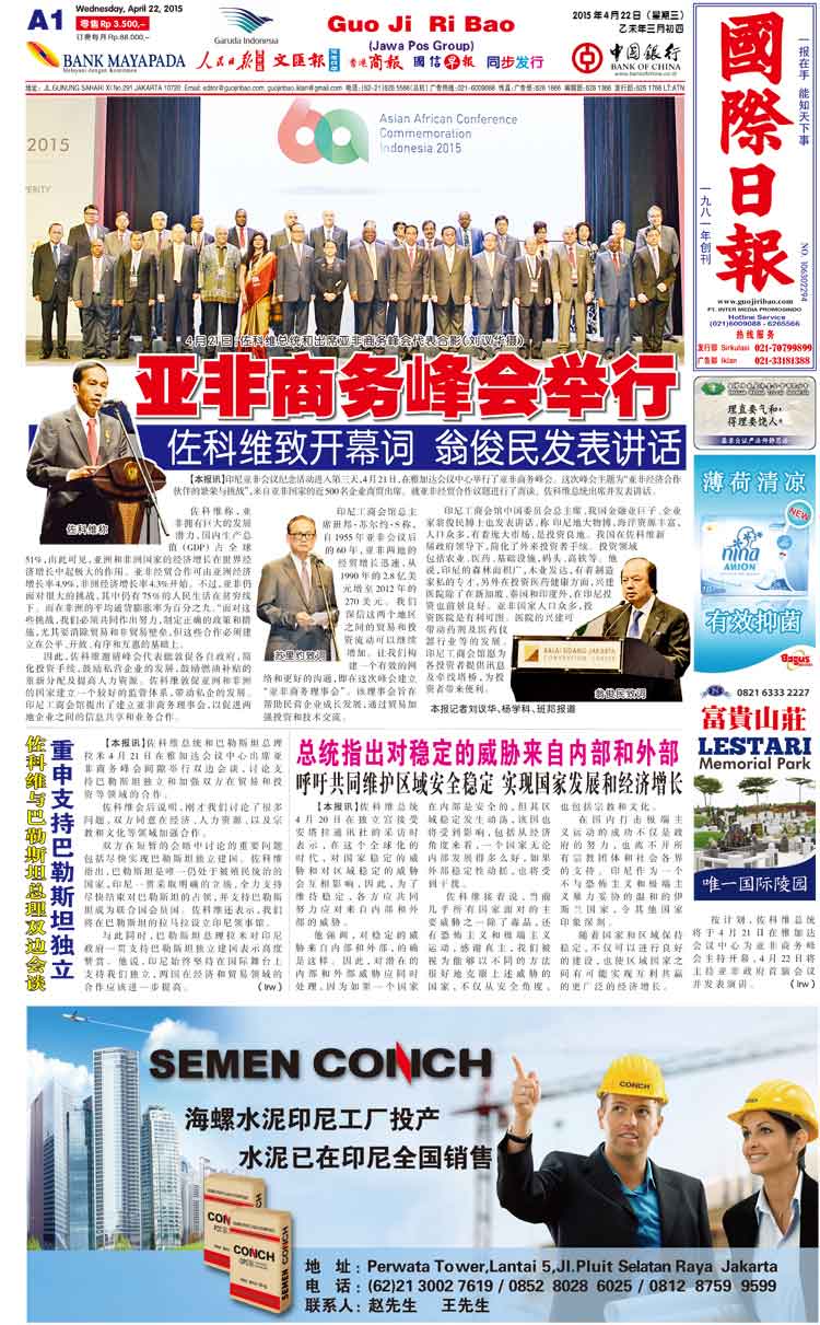 4月21日,亞非商業(yè)峰會在雅加達(dá)舉行,寶鷹集團(tuán)董事局主席古少明以亞洲企業(yè)商賈身份應(yīng)邀出席。4月22日,《國際日報》刊登了峰會報道,并在A8版特別報道了峰會上印尼工商會館和中國貿(mào)促會簽署合作協(xié)議事宜。引人注目的是,《國際日報》還以“中國寶鷹集團(tuán)董事局古少明應(yīng)邀參加亞非商業(yè)峰會”為題,特別報道了“一帶一路”政策背景下寶鷹集團(tuán)在印尼的戰(zhàn)略布局?,F(xiàn)本網(wǎng)予以轉(zhuǎn)載。