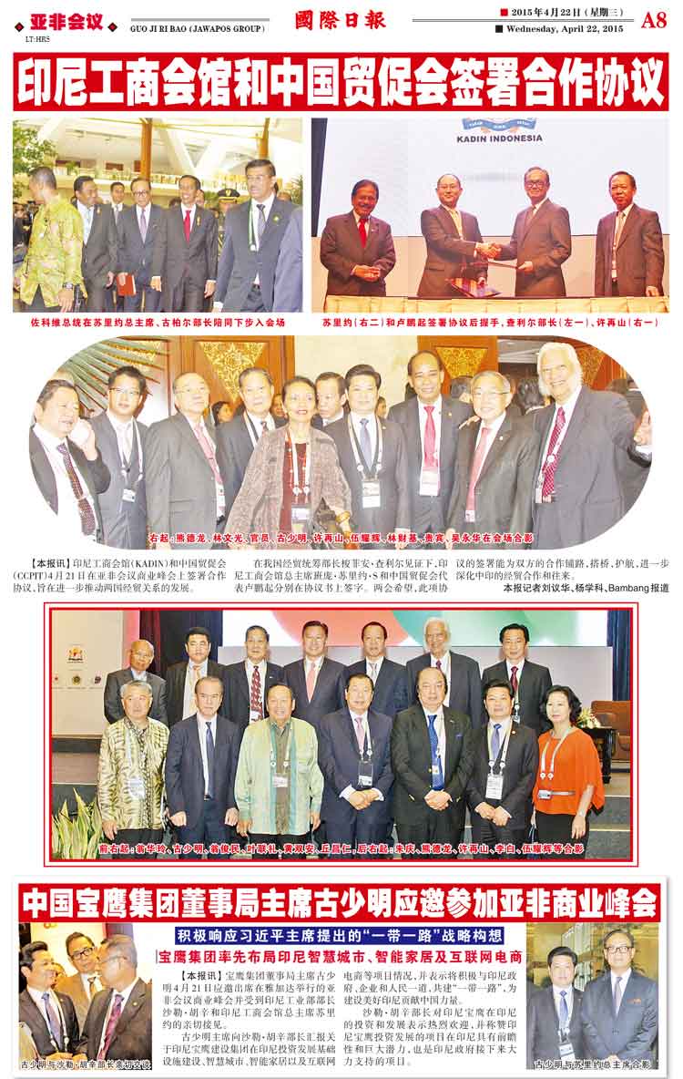 《國際日報》以“中國寶鷹集團(tuán)董事局古少明應(yīng)邀參加亞非商業(yè)峰會”為題,特別報道了“一帶一路”政策背景下寶鷹集團(tuán)在印尼的戰(zhàn)略布局。
