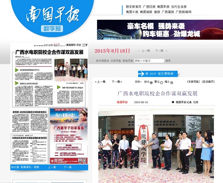 近日,廣西省級都市報(bào)《南國早報(bào)》以“廣西水電職院校企合作謀雙贏發(fā)展”為題,刊登了深圳市寶鷹建設(shè)集團(tuán)股份有限公司與廣西水電職業(yè)學(xué)院共建“寶鷹建筑學(xué)院”,“現(xiàn)代學(xué)徒制”培養(yǎng)專業(yè)人才方式的相關(guān)報(bào)道。