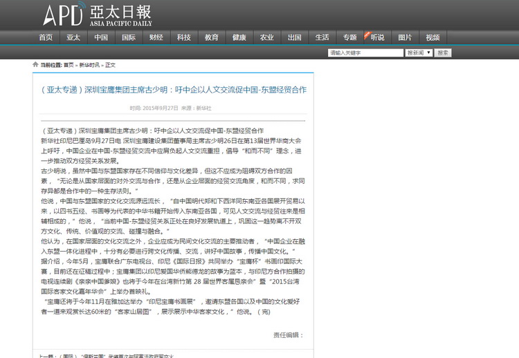 由新華社亞太總分社主辦的《亞太日?qǐng)?bào)》以《深圳寶鷹集團(tuán)主席古少明:吁中企以人文交流促中國(guó)-東盟經(jīng)貿(mào)合作》為題,詳細(xì)報(bào)道了古少明主席在東盟區(qū)域一體化合作論壇上發(fā)表演講的主旨,并介紹了寶鷹集團(tuán)以人文促進(jìn)國(guó)際文化交流的實(shí)際業(yè)績(jī)。