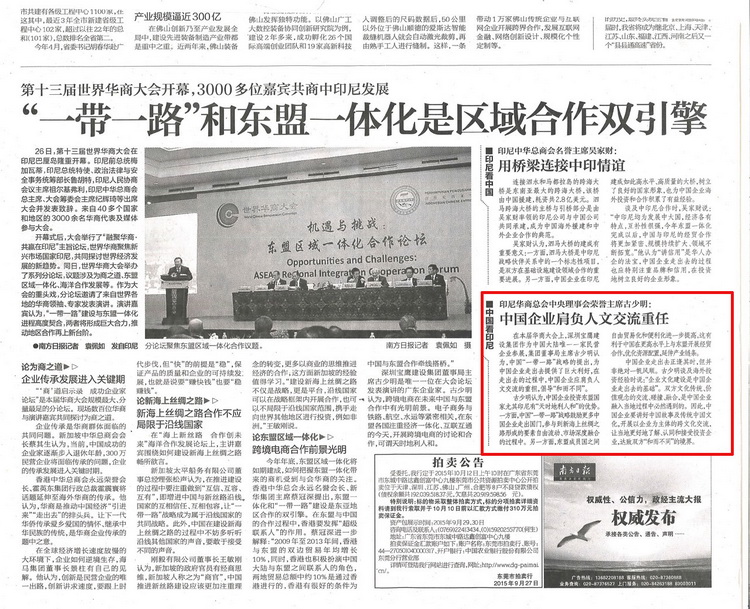 廣東省省委機(jī)關(guān)報(bào)、主流嚴(yán)肅大報(bào)《南方日?qǐng)?bào)》在要聞版報(bào)道第十三屆世界華商大會(huì)時(shí),以《中國(guó)企業(yè)要肩負(fù)人文交流為重任》為題闡述了古少明主席在東盟一體化論壇演講中提出的中國(guó)企業(yè)在走出去的過(guò)程中應(yīng)肩負(fù)人文交流重任的的觀點(diǎn)。
