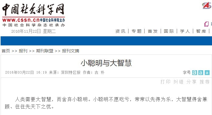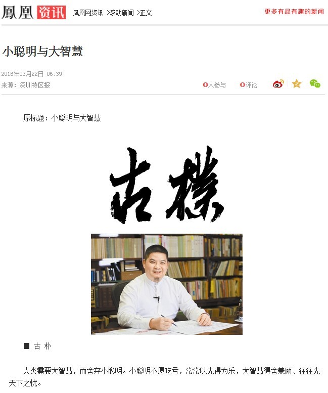 近日,《深圳特區(qū)報(bào)》、鳳凰網(wǎng)、中國(guó)社會(huì)科學(xué)網(wǎng)等媒體相繼刊登轉(zhuǎn)載古樸副總裁文章《小聰明與大智慧》,全文如下: