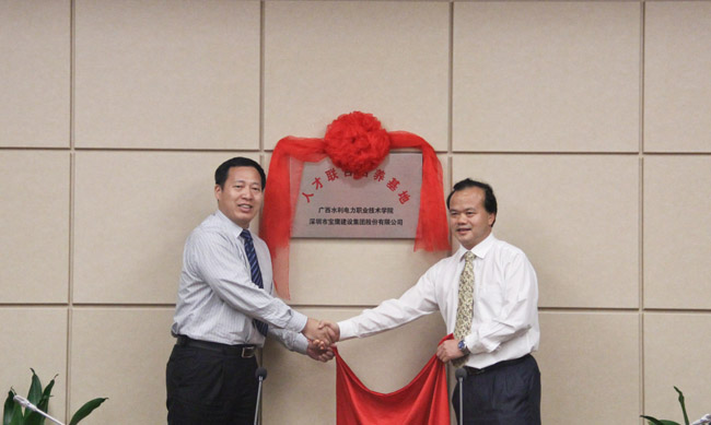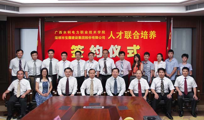2012年7月8日,深圳市寶鷹建設集團股份有限公司(下簡稱“寶鷹集團”)與 廣西 水利電力職業(yè)技術學院(下簡稱“廣西水電學院”)人才聯(lián)合培養(yǎng)簽約儀式暨人才聯(lián)合培養(yǎng)基地揭牌儀式在寶鷹集團總部隆重舉行。廣西水電學院院長、教授、高級工程師劉延明,副院長、博士生導師、教授黃偉軍等及寶鷹集團常務副總裁許平、董事長助理古德、副總裁古樸等領導出席了儀式。