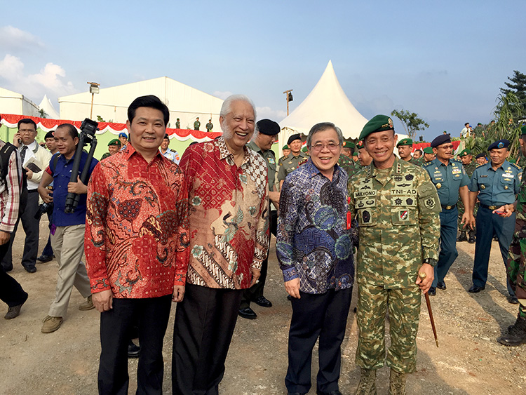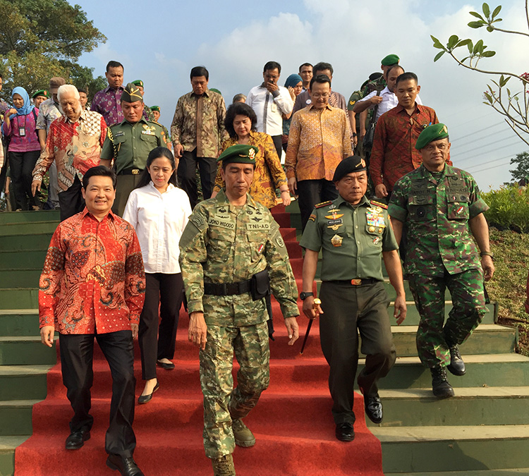 儀式結(jié)束后,佐科維總統(tǒng)在國軍總司令Moeldoko上將等陪同下離開會場(右起:陸軍總參謀長Gabot上將、國軍總司令Moeldoko上將、印尼總統(tǒng)佐科維、政治安全統(tǒng)籌部長Purdijatno、寶鷹集團董事局主席古少明等)