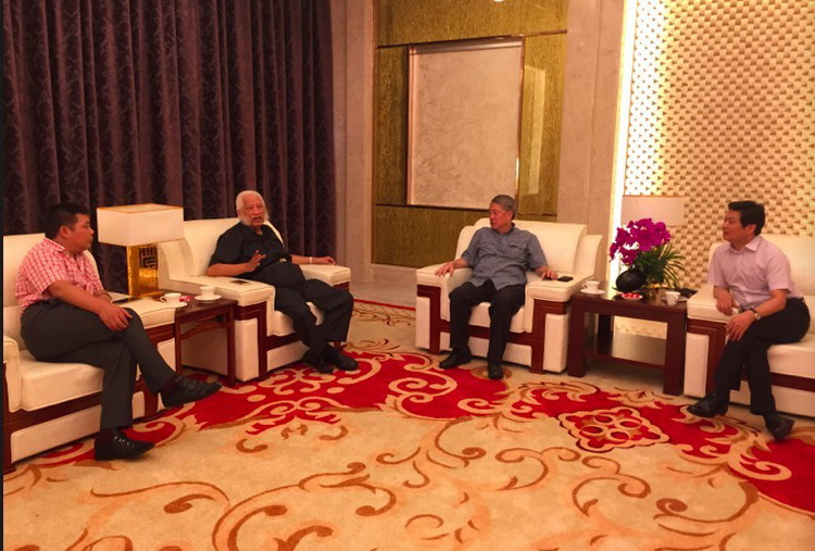 雙方座談(右二為印尼INTILAND地產(chǎn)集團(tuán)董事長(zhǎng)吳端華、左二為印尼熊氏集團(tuán)董事長(zhǎng)熊德龍、右一為寶鷹集團(tuán)董事局主席古少明)