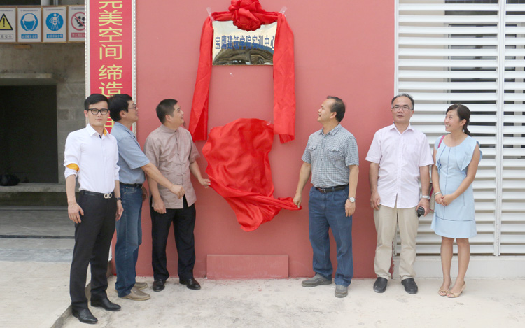 古樸副總裁(左三)、吳義課總裁助理(左一)和劉延明院長(右三)等校方領(lǐng)導(dǎo)共同為寶鷹建筑學(xué)院實訓(xùn)中心揭牌