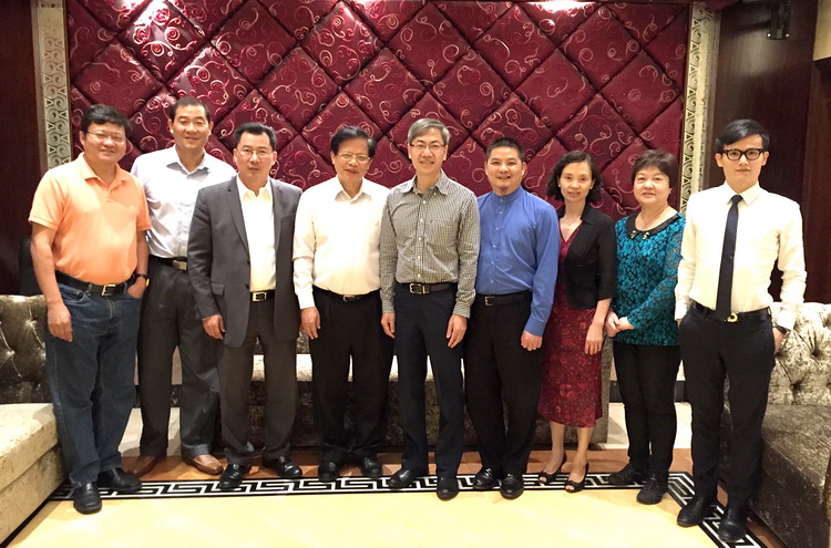 美國國會共和黨全國貿(mào)易顧問委員會名譽(yù)主席、美國哈佛管理公司·美國教育中心總裁陳麥克博士(右二)與李大西博士(左二)、胡蘭萍主席(右一)和古樸副總裁(左一)