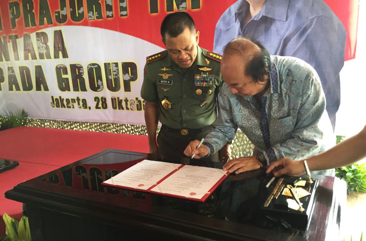 (印尼《國(guó)際日?qǐng)?bào)》訊)10月28日,翁俊民基金會(huì)捐贈(zèng)印尼國(guó)軍總部千套房屋移交儀式在雅加達(dá)東區(qū)Cijantung的陸軍特種部隊(duì)第7作戰(zhàn)騎兵營(yíng)總部舉行。印尼國(guó)軍總司令卡鐸,翁俊民基金會(huì)創(chuàng)辦人、國(guó)信集團(tuán)總裁翁俊民博士,寶鷹集團(tuán)董事局主席、印尼寶鷹總裁古少明出席了移交儀式。