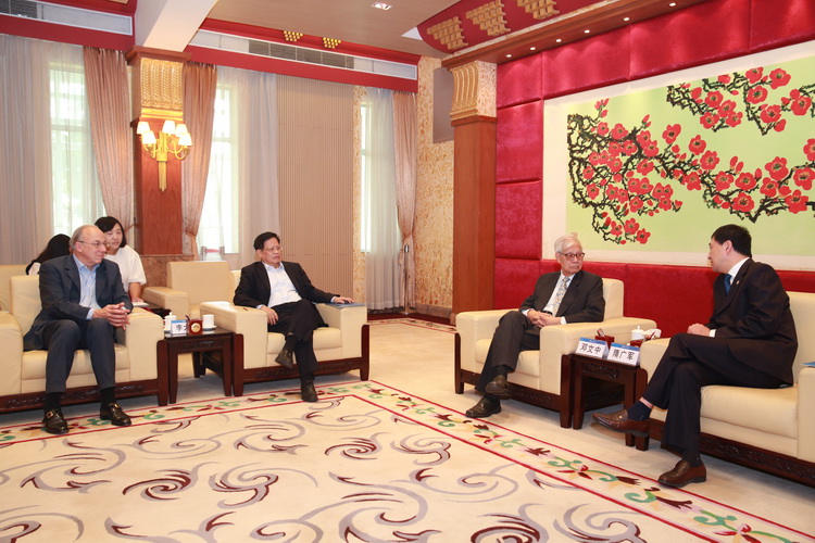 廣外黨委書(shū)記隋廣軍(右一)會(huì)見(jiàn)寶鷹講堂三位主講人鄧文中院士(右二)、李大西博士(左二)、Anderson教授(左一)