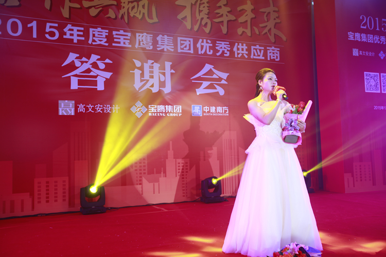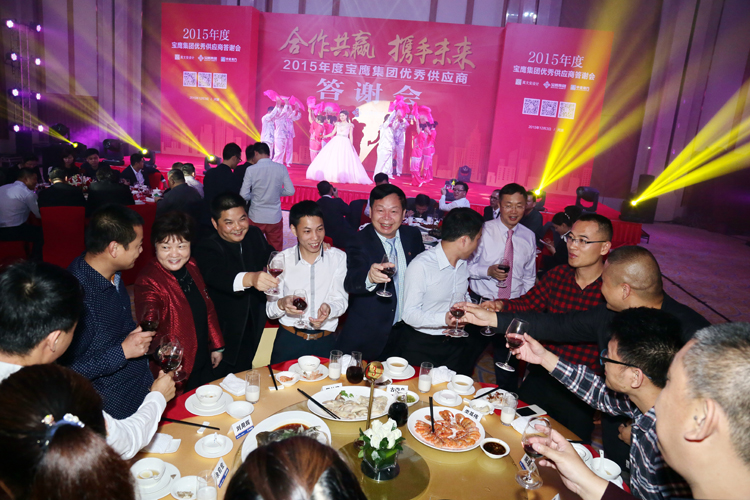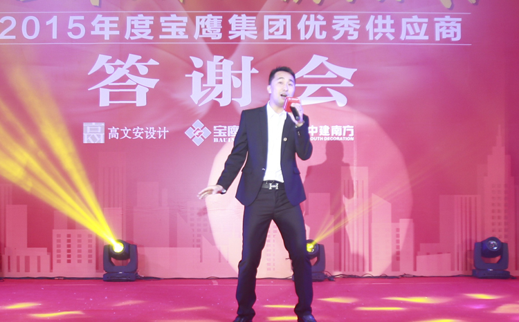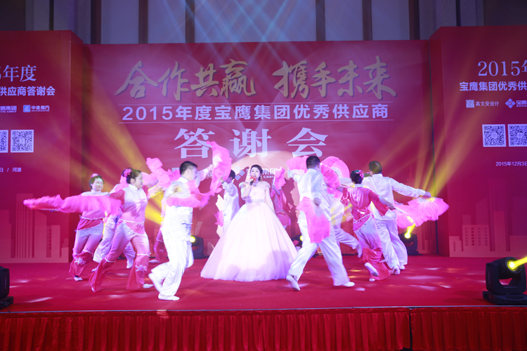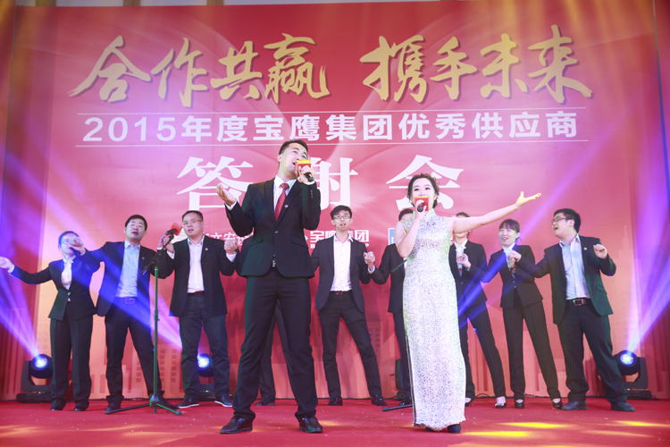 在諸位供應(yīng)商與三方領(lǐng)導(dǎo)一起舉杯,滿飲此杯時,2015寶鷹集團(tuán)優(yōu)秀供應(yīng)商答謝會晚宴正式開始。一曲曲深情的歌兒唱出溫馨的祝福,一支支優(yōu)美的舞蹈跳出一個前程錦繡。熱鬧非凡的舞獅表演象征著紅紅火火,《今宵如此美麗》的曼妙歌聲讓諸位嘉賓流連忘返,《相親相愛的一家人》訴說著濃濃的情意,《大展宏圖》則傳遞出對未來的雄心壯志。參會嘉賓與諸位領(lǐng)導(dǎo)一邊觀賞著精彩的節(jié)目,一邊為友誼和新的希望舉杯,現(xiàn)場沉浸在一派活潑熱鬧的氣氛中。值得一提的是,本次供應(yīng)商答謝會加入了嘉賓點歌環(huán)節(jié),諸位嘉賓分別用歌唱表達(dá)著自己心中的喜悅,亦為此次供應(yīng)商答謝會畫上了圓滿的句號。