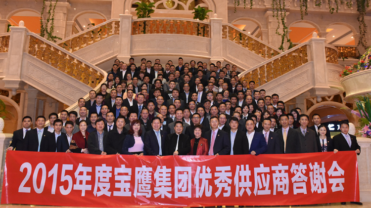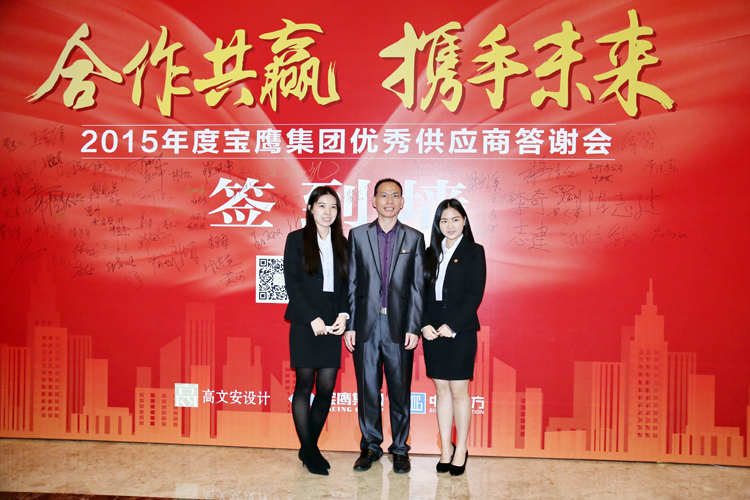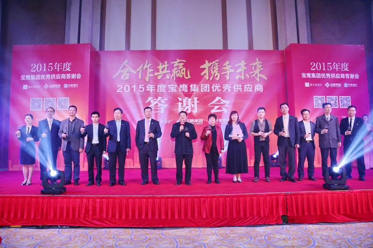 答謝會上,寶鷹集團(tuán)總裁成湘文對各位優(yōu)秀供應(yīng)商代表的到來表示熱烈歡迎,并向在2015年對寶鷹集團(tuán)、中建南方和高文安設(shè)計的事業(yè)給予莫大支持和幫助的各位朋友表示衷心的感謝。成湘文總裁說:寶鷹集團(tuán)在2015年里延續(xù)2014年的穩(wěn)健步伐,在提升主營業(yè)務(wù)的同時不斷打開格局,以更積極的姿態(tài)踐行“互聯(lián)網(wǎng)+”戰(zhàn)略和“一帶一路”戰(zhàn)略。2015年,寶鷹集團(tuán)順勢而為,成功牽手全球知名室內(nèi)設(shè)計品牌——高文安設(shè)計,打響了“以設(shè)計帶動施工”發(fā)展戰(zhàn)略。2015年,寶鷹集團(tuán)把握大勢,果敢入股二維碼行業(yè)領(lǐng)導(dǎo)者——武漢矽感,再次深耕“互聯(lián)網(wǎng)+”行業(yè)。2015年,寶鷹集團(tuán)文化開路,奮翅海外,在“一帶一路”上愈行愈遠(yuǎn)。斐然的成績離不開集團(tuán)領(lǐng)導(dǎo)班子的正確決策,離不開每一位寶鷹人的不竭努力,更離不開各位供應(yīng)商對寶鷹集團(tuán)日繼一日的大力支持。我們未來還有著更廣闊的合作深度和合作層次,寶鷹集團(tuán)將一直堅持誠信經(jīng)營,共贏經(jīng)商的合作理念,高度重視合作伙伴利益,在新時代下繼續(xù)引領(lǐng)行業(yè),創(chuàng)造輝煌。