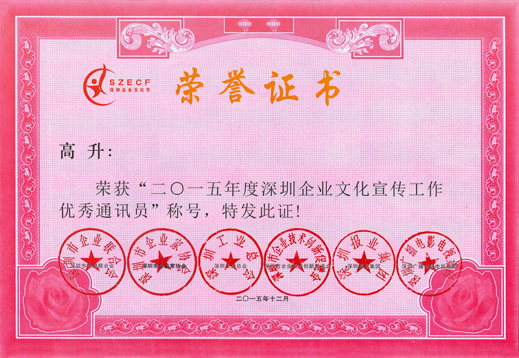 ▲文化品牌部主管高升領(lǐng)取2015年度深圳企業(yè)文化宣傳工作先進(jìn)單位與優(yōu)秀通訊員獎(jiǎng)