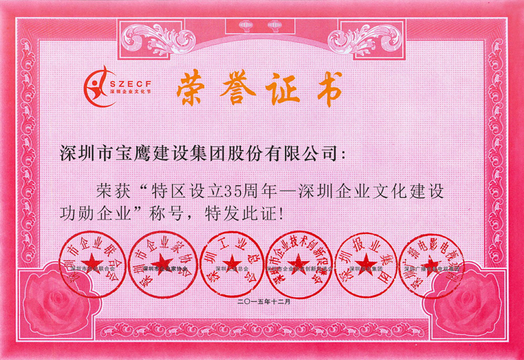 126家深圳企業(yè)在頒獎(jiǎng)典禮上獲得“特區(qū)設(shè)立35周年-深圳企業(yè)文化建設(shè)功勛企業(yè)”等榮譽(yù)。其中,寶鷹集團(tuán)憑借多年來沉淀的極富傳統(tǒng)與時(shí)代精神的企業(yè)文化內(nèi)涵,豐富多彩的企業(yè)文化表現(xiàn)形式,活潑多樣的企業(yè)文化活動(dòng)獲得多項(xiàng)企業(yè)文化建設(shè)殊榮,包括2015年度深圳企業(yè)文化建設(shè)十佳單位、特區(qū)設(shè)立35周年-深圳企業(yè)文化建設(shè)功勛企業(yè)、特區(qū)設(shè)立35周年-深圳企業(yè)文化建設(shè)功勛人物、2015年度深圳企業(yè)文化宣傳工作先進(jìn)單位與優(yōu)秀通訊員等獎(jiǎng)項(xiàng)。古少明主席、古少波董事長(zhǎng)、文化品牌部主管高升先后領(lǐng)取了各獎(jiǎng)項(xiàng)。