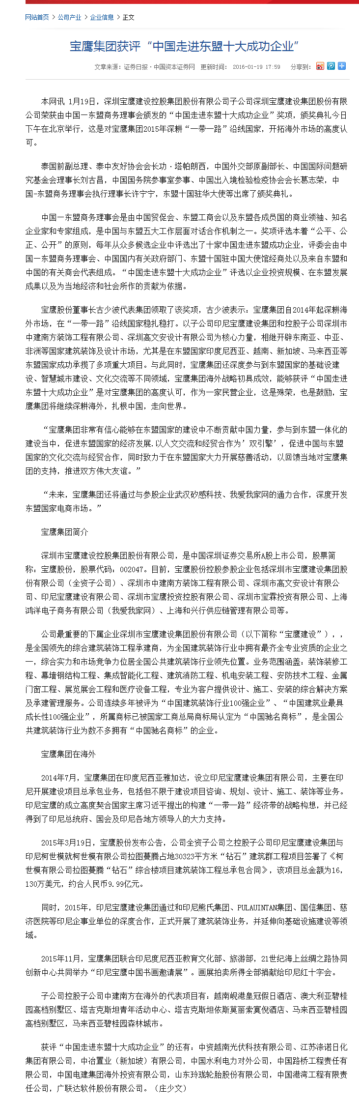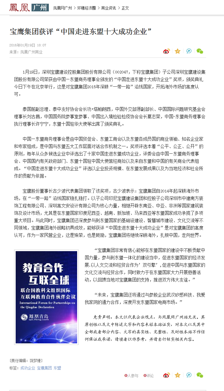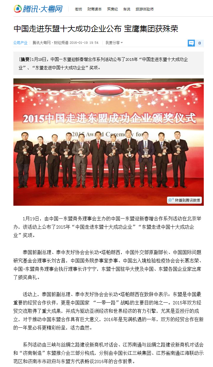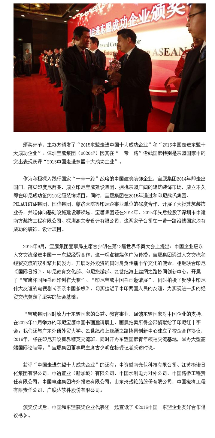 1月19日,由中國(guó)—東盟商務(wù)理事會(huì)、東盟北京委員會(huì)主辦的中國(guó)—東盟迎新春增合作系列活動(dòng)在北京舉辦,活動(dòng)上公布了2015年“中國(guó)走進(jìn)東盟十大成功企業(yè)”“東盟走進(jìn)中國(guó)十大成功企業(yè)”獎(jiǎng)項(xiàng)。深圳寶鷹集團(tuán)(股票代碼:002047)因在“一帶一路”沿線國(guó)家特別是東盟國(guó)家中的突出表現(xiàn)而獲評(píng)“2015中國(guó)走進(jìn)東盟十大成功企業(yè)”。