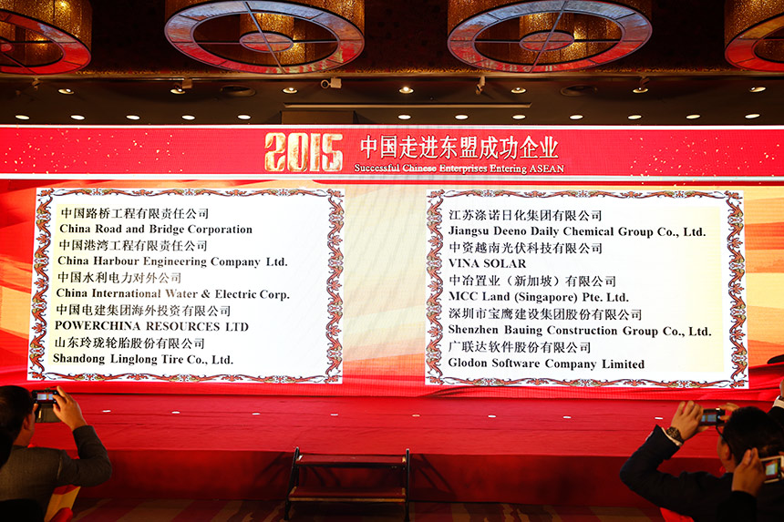 頒獎(jiǎng)環(huán)節(jié),緬甸駐華大使蒂林翁宣讀“2015中國(guó)走進(jìn)東盟十大成功企業(yè)”名單。獲評(píng)“2015中國(guó)走進(jìn)東盟十大成功企業(yè)”的有:中資越南光伏科技有限公司、深圳寶鷹建設(shè)集團(tuán)股份有限公司、江蘇滌諾日化集團(tuán)有限公司、中冶置業(yè)(新加坡)有限公司、中國(guó)水利電力對(duì)外公司、中國(guó)路橋工程責(zé)任有限公司、中國(guó)電建集團(tuán)海外投資有限公司、山東玲瓏輪胎股份有限公司、中國(guó)港灣工程有限責(zé)任公司、廣聯(lián)達(dá)軟件股份有限公司。其中,中字頭企業(yè)占據(jù)6家。
