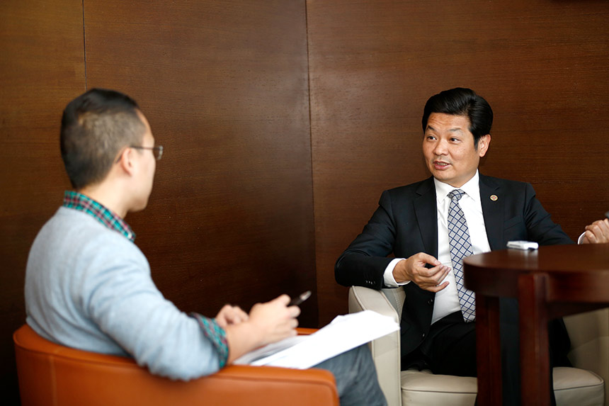 ▲新加坡《聯(lián)合早報(bào)》記者就“一帶一路”話題采訪寶鷹集團(tuán)董事局主席古少明