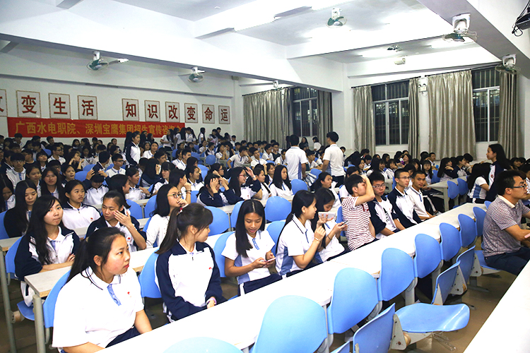 本次寶鷹建筑學(xué)院宣講團(tuán)由寶鷹建筑學(xué)院黨總支副書記余娜、寶鷹集團(tuán)總裁助理羅志龍帶隊(duì),由廣西水利電力職業(yè)技術(shù)學(xué)院教師及寶鷹集團(tuán)工程管理中心、行政管理中心同事共計(jì)12人組成。宣講團(tuán)相繼走進(jìn)了陸河中學(xué)、河口中學(xué)、水唇中學(xué)、河田中學(xué)、陸河職業(yè)技術(shù)學(xué)院,普寧大坪中學(xué)、梅林中學(xué)7所高級(jí)中學(xué)。