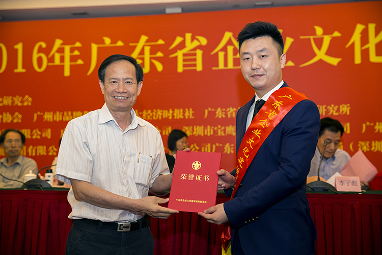 2016年廣東省企業(yè)文化建設(shè)大獎頒獎現(xiàn)場(左:廣東省企業(yè)文化研究會會長田豐;右:文化品牌部總經(jīng)理董賓)