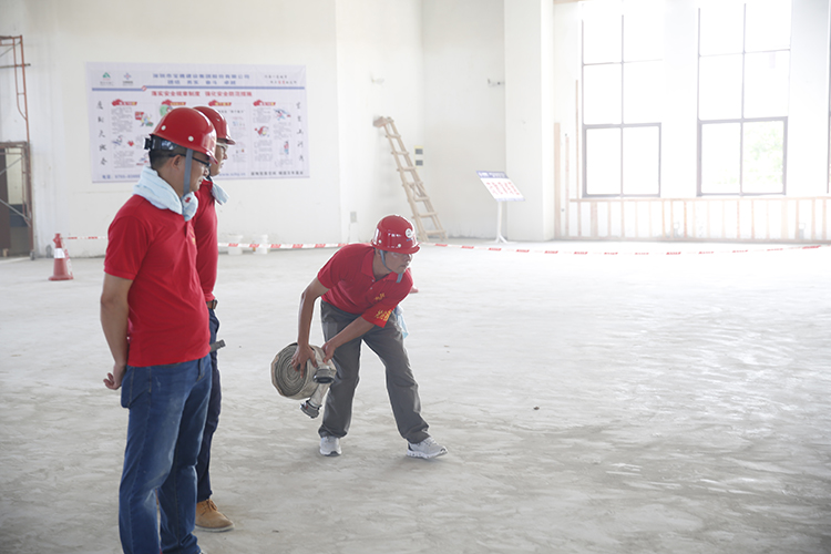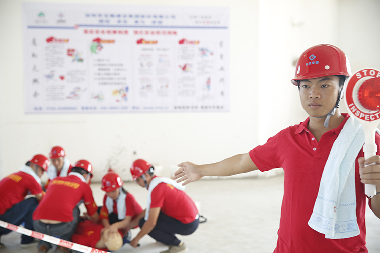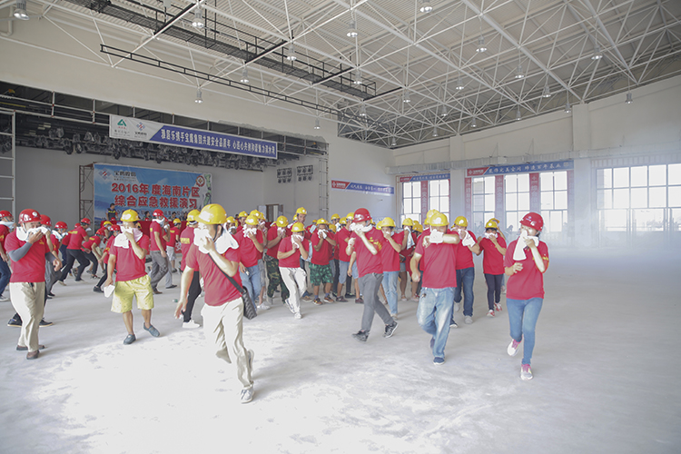演習(xí)項目分為防臺風(fēng)演習(xí)、防雨汛演習(xí)、消防疏散演習(xí)三個大項,分別模擬了觸電、中暑、火災(zāi)、暴雨臺風(fēng)等工地常見的突發(fā)安全事件和海南當(dāng)?shù)爻0l(fā)的自然氣象災(zāi)害。在觸電事件發(fā)生后,演練人員封鎖事件現(xiàn)場、撥打120急救熱線、按照正確的自救方法對傷員進行救治,迅速報告項目安全人員,同時等待專業(yè)救助人員前來救治。在火災(zāi)發(fā)生后,現(xiàn)場濃煙密布,演練人員迅速自發(fā)分為三隊從安全通道有秩序地撤離現(xiàn)場。暴雨、中暑等演練亦遵循各自的特點,在模擬實戰(zhàn)中為觀摩人員獻上豐富的一課。在滅火演練中,寶鷹集團總裁成湘文上陣為觀摩者示范了消防設(shè)備的使用方法。