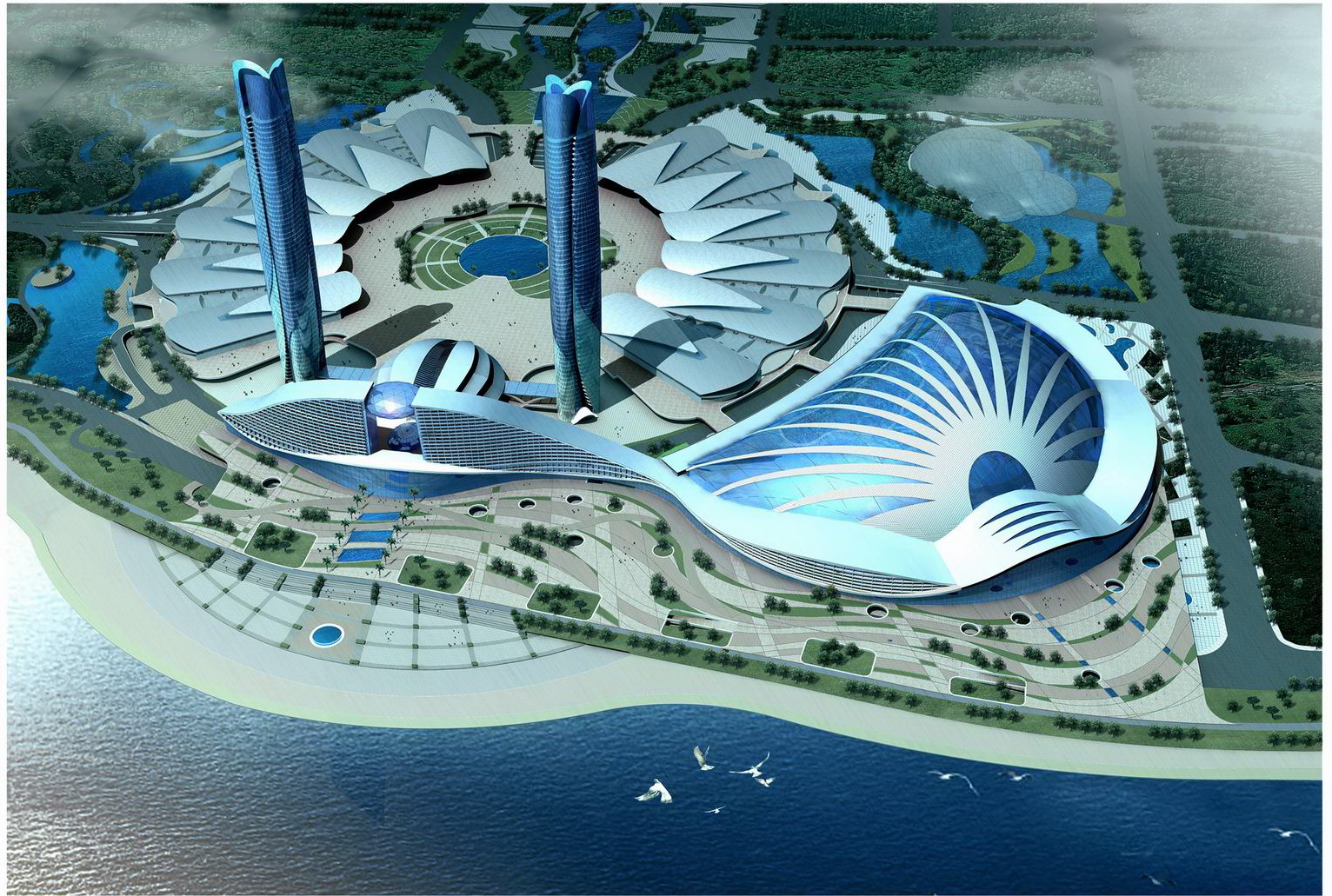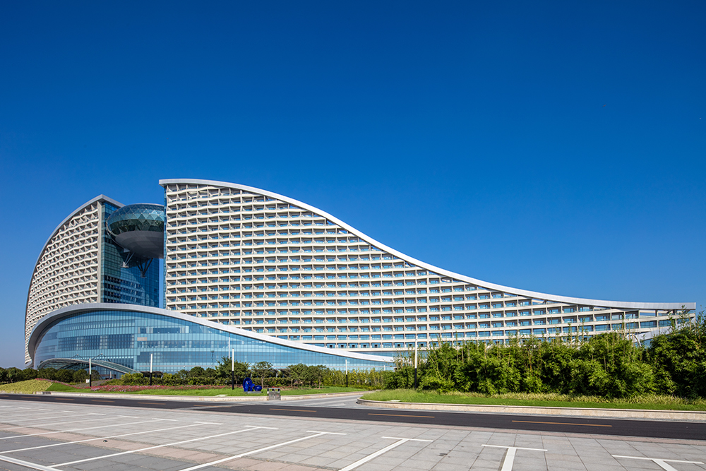 國(guó)際會(huì)議中心與洲際酒店渾然一體,形似貝殼的仿生學(xué)設(shè)計(jì)極具視覺震撼力。位于國(guó)際會(huì)議中心頂層的空高16米、6,000平方米的無柱豪華宴會(huì)廳,是華中地區(qū)最大的宴會(huì)廳。