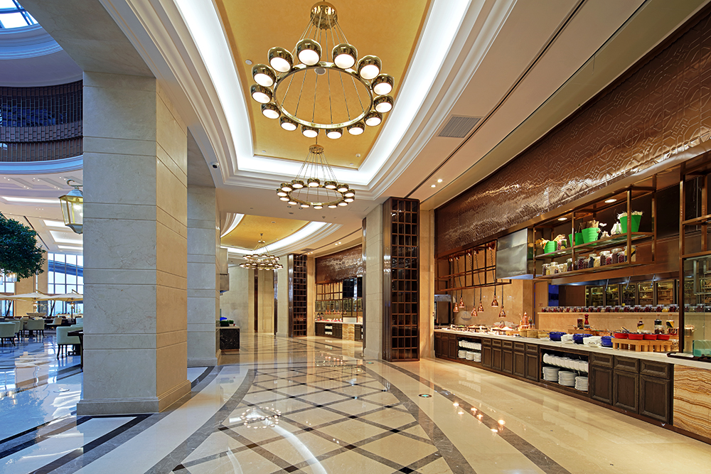一層大堂,二層大堂、大堂吧簡(jiǎn)潔大氣,四季廳歐式風(fēng)情濃郁,四層宴會(huì)廳和中餐區(qū)、健身中心也各有特色。在材質(zhì)上,寶鷹集團(tuán)大量使用高品質(zhì)石材,如廳柱、地面等,使得整體內(nèi)飾兼具實(shí)用性與觀賞性,既營(yíng)造出國(guó)際會(huì)展酒店的商務(wù)風(fēng),又不失美學(xué)享受。
